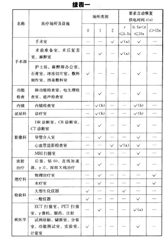2、醫(yī)療場所分類及自動(dòng)恢復(fù)供電時(shí)間宜符合表一-規(guī)定。