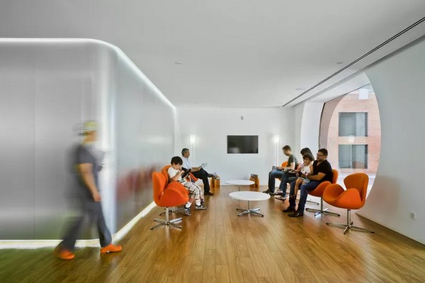 設(shè)計(jì)師將醫(yī)生個(gè)人的診室打造成一系列明亮輕快的空間,而每間診室門則被隱藏在富有韻律感的裝飾墻中。而木質(zhì)標(biāo)牌也彰顯細(xì)節(jié),與整個(gè)空間相呼應(yīng)。