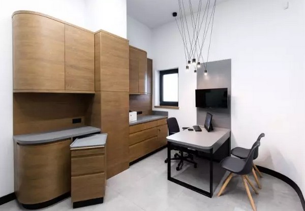 診所的整體設(shè)計(jì)主要展現(xiàn)出空間的功能性、友好性。白色的前臺(tái)由橡木桌子構(gòu)成,外形模仿醫(yī)療十字架,形象表達(dá)出該建筑的實(shí)際用途。其必要的功能都沿著曲線排列,在這個(gè)公共區(qū)域營(yíng)造出一種平靜的感覺(jué),更重要的是前臺(tái)的獨(dú)特設(shè)計(jì)給初來(lái)的顧客留下良好的印象。