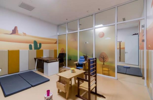 大樓二層是兒童康復(fù)特色專區(qū),過道有專題墻繪故事寫真,三個主題康復(fù)室獨立設(shè)置在東側(cè)、南側(cè)和西側(cè)。該康復(fù)區(qū)用卡通童話作為主線,串聯(lián)沙漠、海洋、森林三個主題。