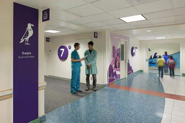 即起到填補視覺空白、緩解視覺疲勞的作用。導視牌的安放位置,主要是在人流量較大、分叉路口等處,這不但起到指示的作用,還可以豐富醫(yī)療科室的空間環(huán)境,尤其是兒童醫(yī)院的導視,可通過有趣、活潑的圖案,或是多種色彩的搭配,從而使診室、候診區(qū)等功能區(qū)域添些美感,還能緩解患兒緊張的心理壓力。