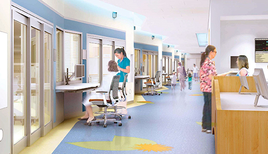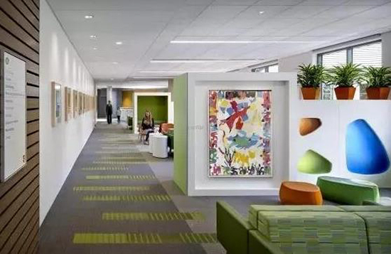 比如,斯坦福兒童健康中心的室內(nèi)設(shè)計(jì)中,參考了自然景觀的主要色調(diào),通過(guò)地面鋪裝、標(biāo)識(shí)符號(hào)、藝術(shù)裝置等方式加以抽象演繹,使兒童仿佛置身奇妙的童話世界。另外,醫(yī)院等候空間和走廊處懸掛的裝飾藝術(shù)品也很吸引眼球,如此人性化情感設(shè)計(jì),可以為兒童和家長(zhǎng)創(chuàng)造輕松愉快的就醫(yī)體驗(yàn)。