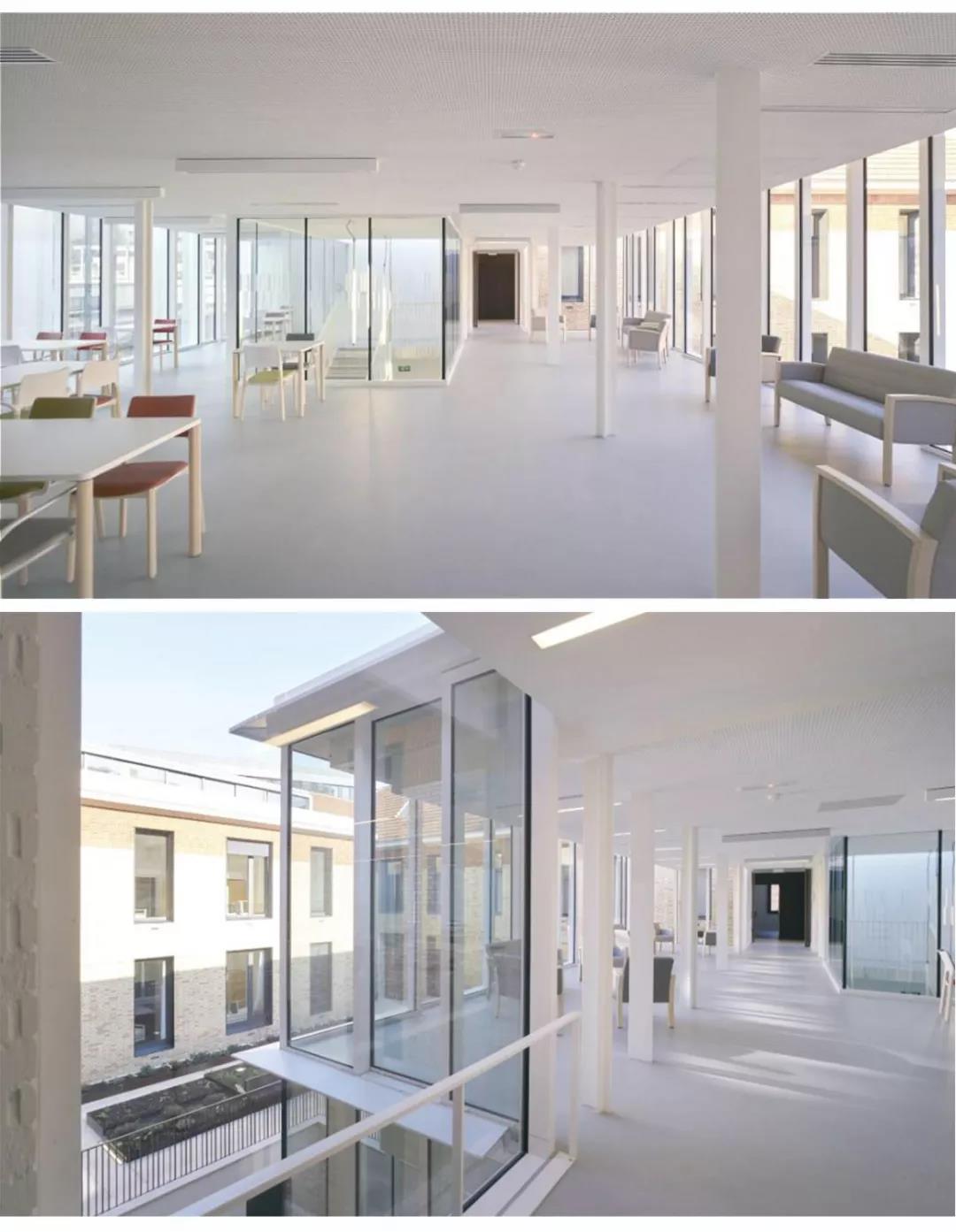 走廊過(guò)道是養(yǎng)老建筑中一個(gè)重要的公共空間,老人們希望在這樣的空間上停留、交流或者欣賞室外景觀,所以可以在走廊過(guò)道上采用全景落地窗和高窗相結(jié)合的開(kāi)窗方式,在保證老人安全的同時(shí)擁有良好的景觀視野。