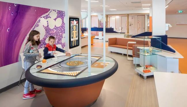 醫(yī)院的3層,設(shè)計(jì)了一個(gè)戶外花園,吸引孩子們走出去擁抱自然風(fēng)景。醫(yī)院還設(shè)計(jì)了“科學(xué)探索中心”,通過互動(dòng)裝置幫助孩子們了解疾病的診斷和治療,從而降低他們的心理壓力。