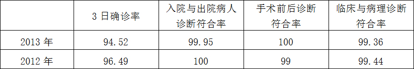 2013年入出院病人診斷符合率99.95%,臨床初診與臨床確診符合率,反映醫(yī)院對(duì)病員入院時(shí)的初步診斷水平,也就是經(jīng)治醫(yī)師的診斷技術(shù)水平。