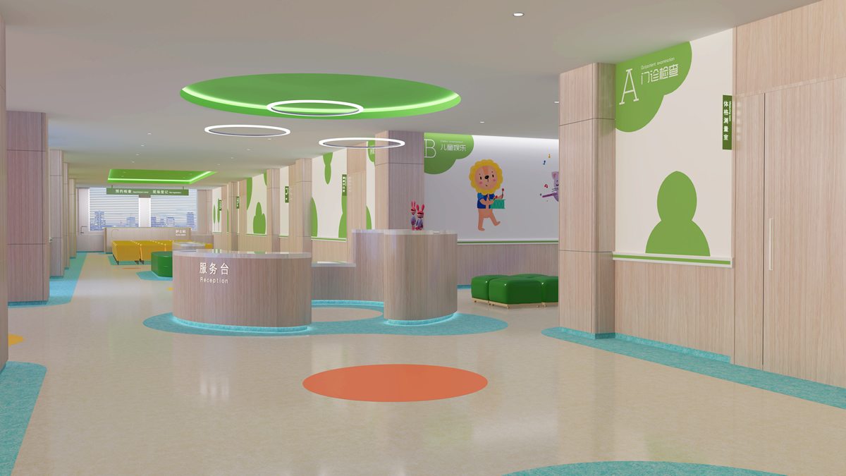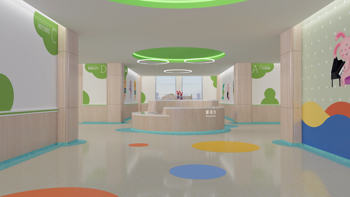 大廳是第一印象為主的空間,所以設(shè)計效果上更注重營造氛圍,重視光照和通風,體現(xiàn)兒童醫(yī)院的專業(yè)性、空間的舒適性,家具以木質(zhì)元素為主,并通過明亮的色彩,充滿童趣的空間以及兒童元素的提取,打造出親切活潑的氛圍,給患兒創(chuàng)造一個輕松、舒適、自然、便捷的診療空間。